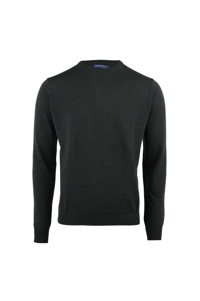 Den klassiske merino strik trøje med rund hals fra Hanstholm, her i flaskegrøn.