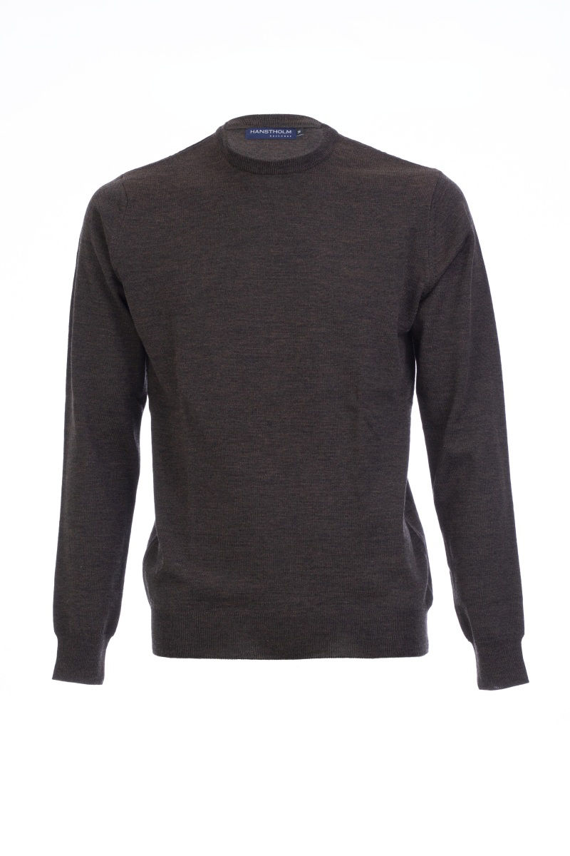 Den klassiske merino strik trøje med rund hals fra Hanstholm, her i mørkebrun.