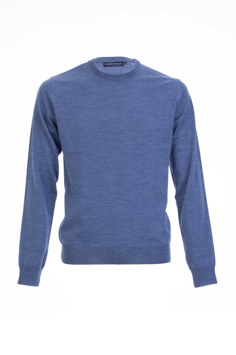 Den klassiske merino strik trøje med rund hals fra Hanstholm, her i en lys blå melange.